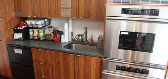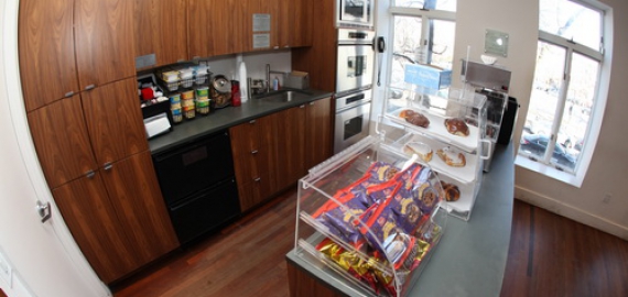 Throughout the day, the coffee is hot and the fridge is well-stocked with a variety of cold sodas and seltzer water, complimenting our selection of hot and cold snacks. From midday on, we also offer hot pizza and hot dogs.
